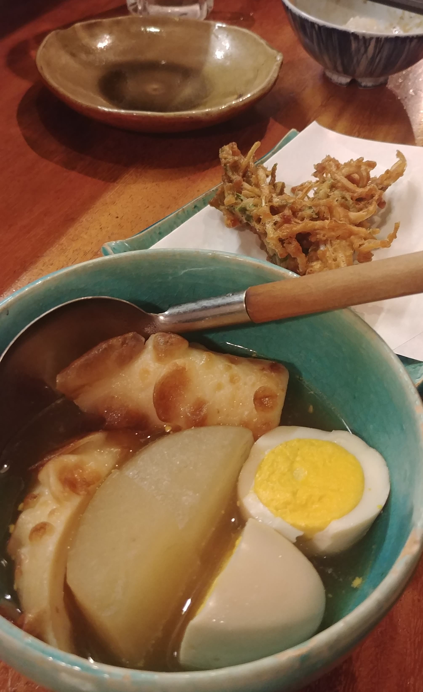 8. Japanese one-pot dish consisting of several ingredients such as boiled eggs, daikon, konjac, and processed fishcakes stewed in a light, soy-flavored dashi broth