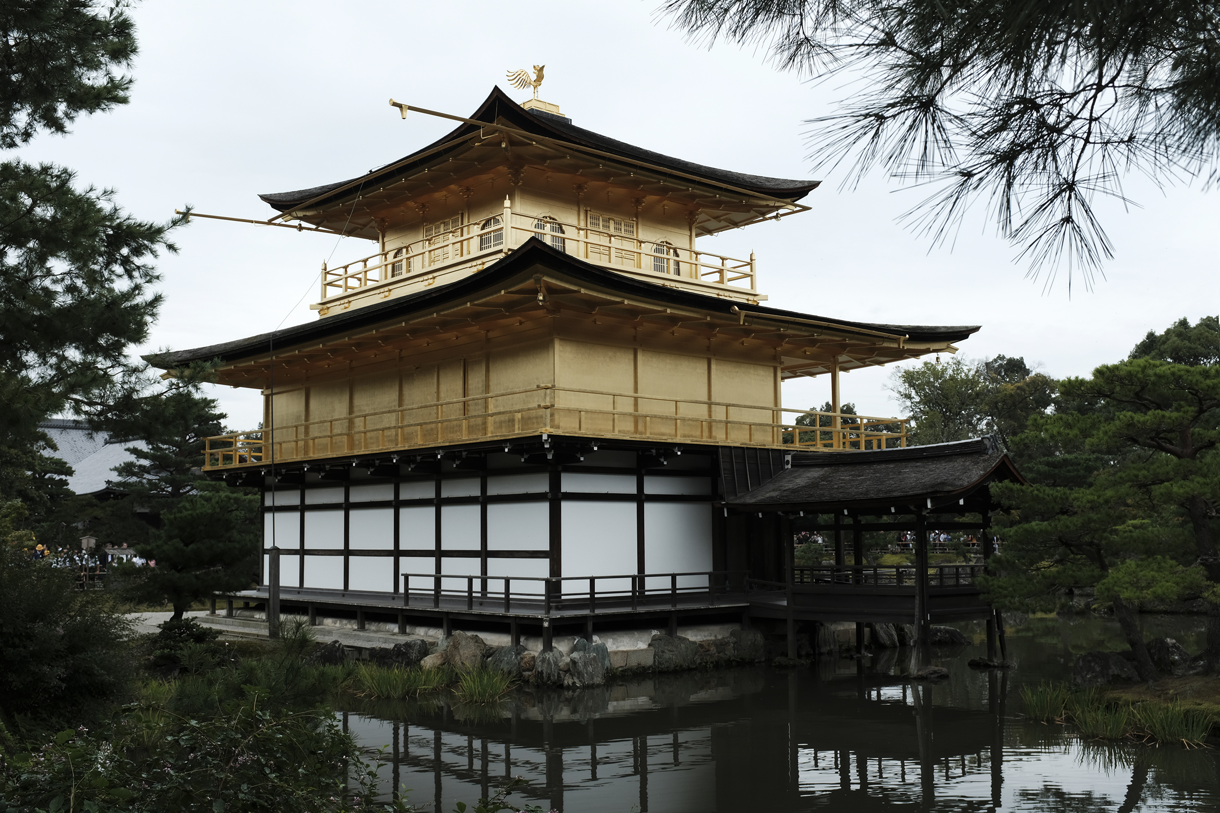 I’m embarrassed that I’m not sure what the first temple was called. It was Higashi Hongan-ji, right beside our breakfast place. It was huge and probably important. Honestly, it was tough keeping on top of it. We then hopped in a taxi and went to Kingkaku-ji. Officially called Rokuon-ji but widely known as the Temple of the Golden Pavilion, it is a top-rated sightseeing destination in Kyoto– rebuilt in 1955 after a fire, this pavilion looks over a lovely pond.  Overlaid in a gold leaf with a golden rooster on top, it shimmers in the sunlight and reflects beautifully off the water. You can enjoy a teahouse before you leave the grounds[/note](the Golden Pavilion–surprise for the first person who can ID it in the photos below). It is really pretty – with a very serene setting.